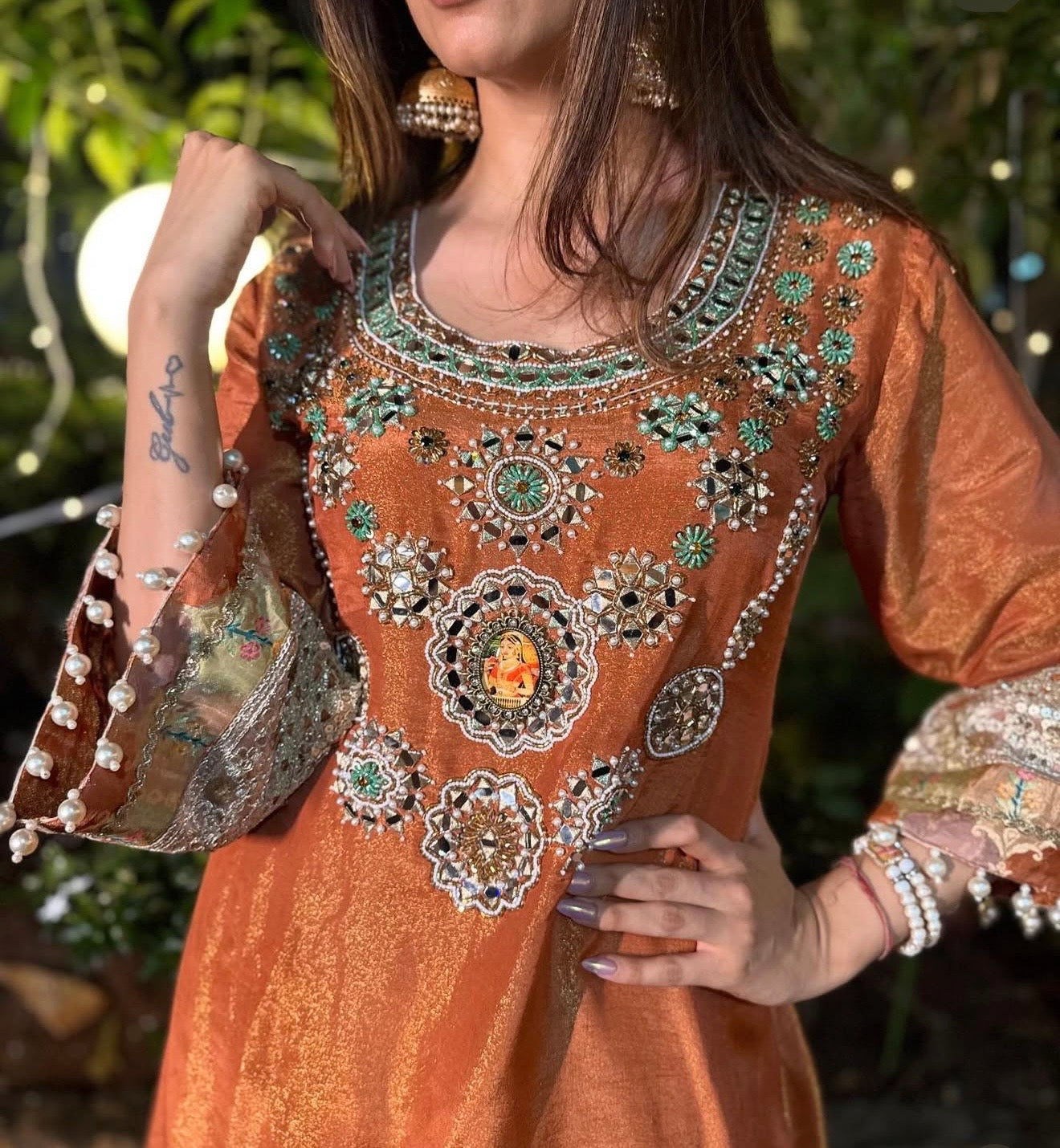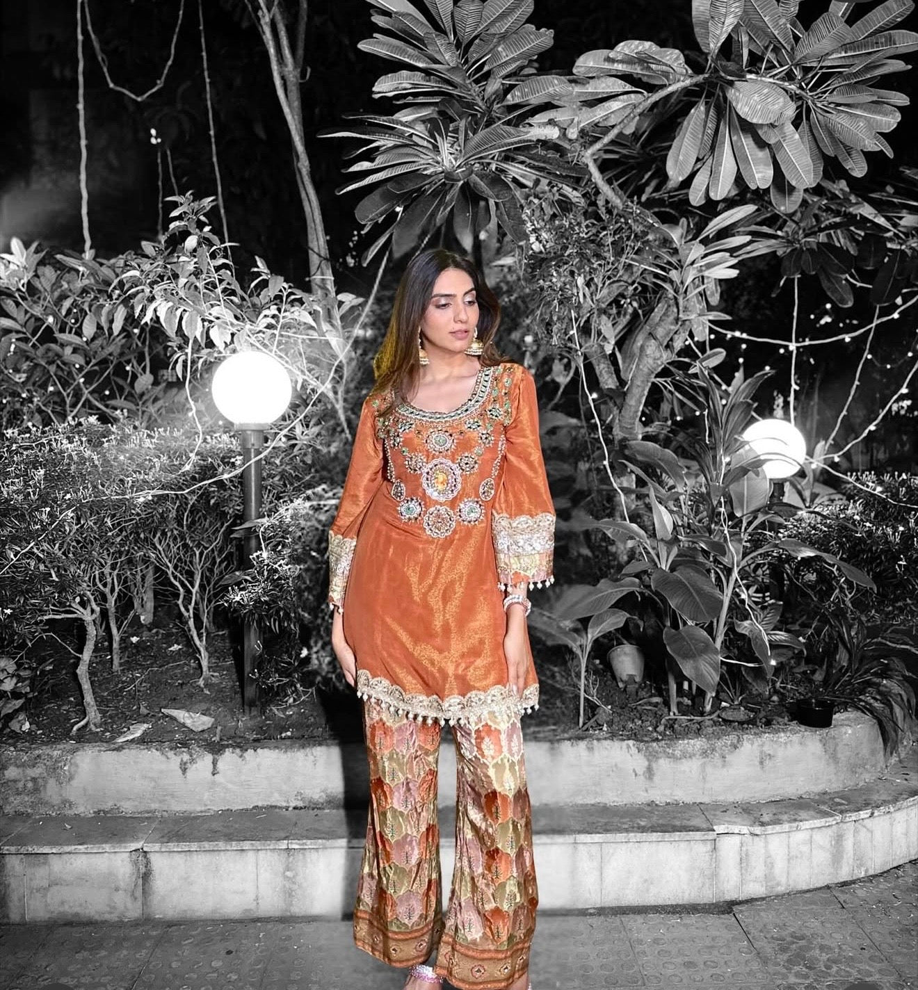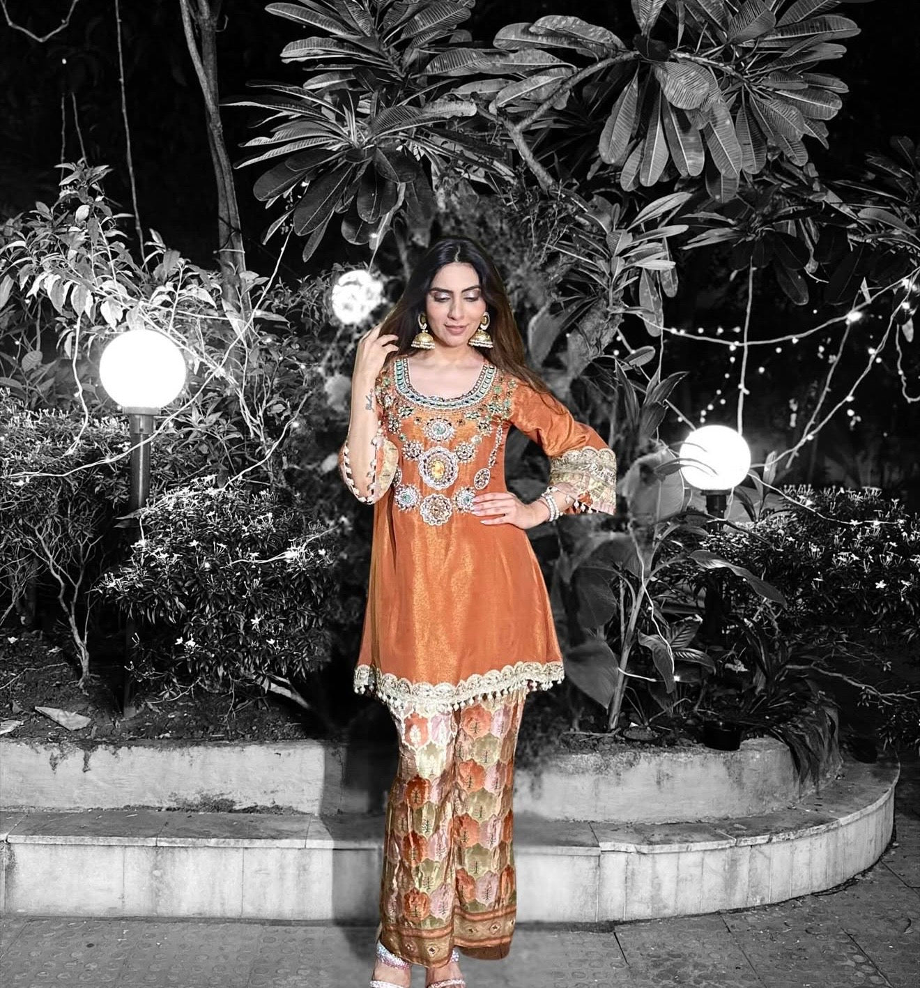 This stunning ensemble from the Aaina Collection captures the essence of royal Indian artistry. Delicate zardozi, gota, and threadwork come together on a classic silhouette, creating a look that is both regal and effortlessly elegant. Designed for women who love tradition with a hint of luxury.